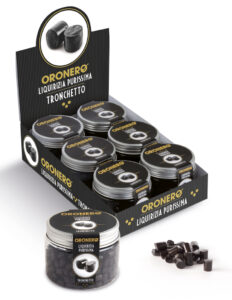 Un packaging particolarmente accattivante ed eccellenza del prodotto: la celebre liquirizia Oronero è disponibile in vari formati, confezioni ideali come consumo famiglia o come oggetto regalo. Barattoli PET, scatoline in metallo, vasi in vetro, bustine, box: la liquirizia Oronero si presenta sottoforma di tronchetti, liquirizia frantumata, rombetti, cuori, bastoncini, radici o in polvere.