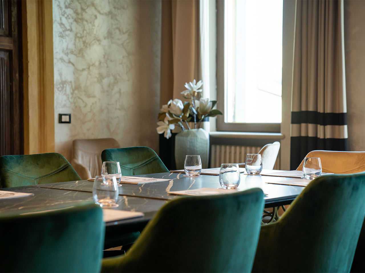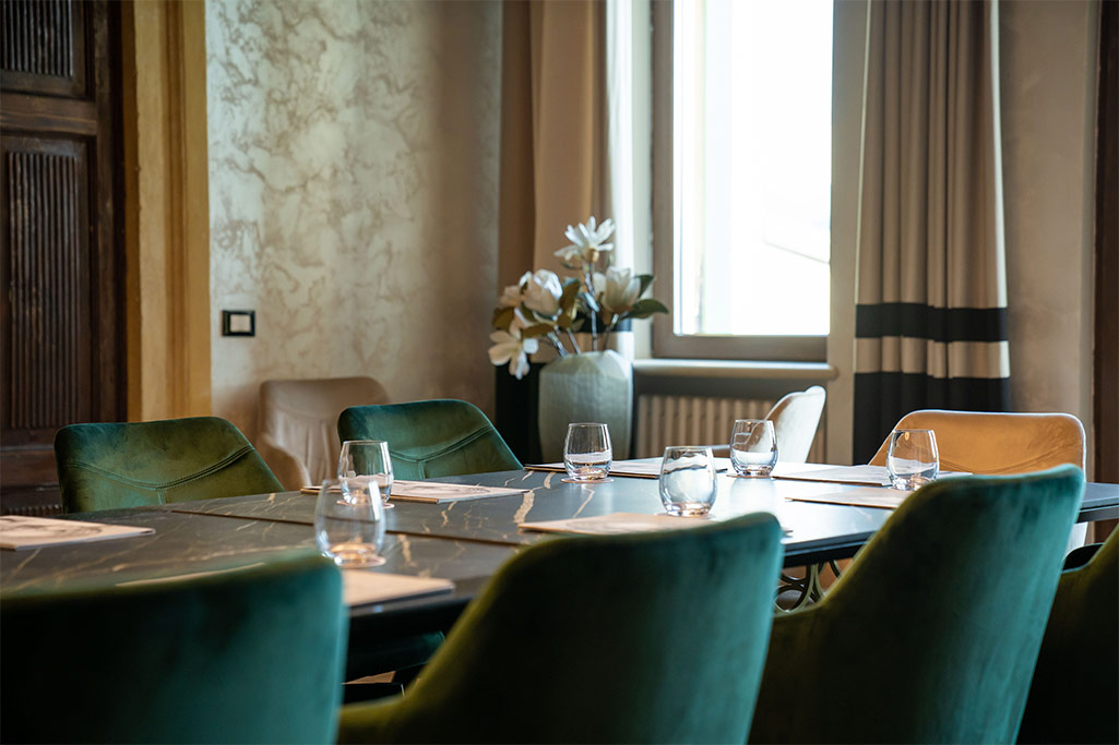 Fino a 30 persone Una sala riunioni con luce naturale ed uno stile business elegante. Completa la proposta il balcone con una meravigliosa vista sui vigneti della Valpolicella.